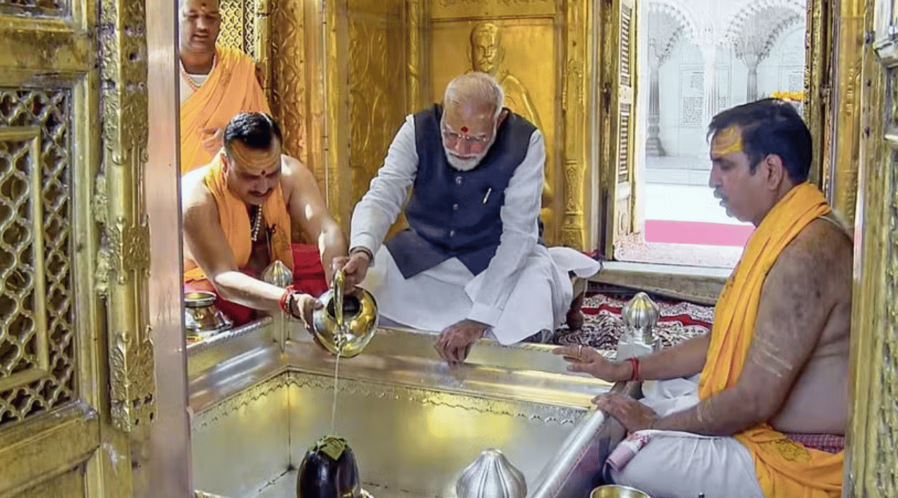 At the temple, Modi performed prayers and rituals accompanied by Vedic chants. Afterward, local representatives welcomed him with traditional items such as a trishul, damru, and a ceremonial stole, which he acknowledged while greeting those present. As he exited the temple complex, chants of “Har Har Mahadev” echoed from the crowd, and Modi responded by waving and folding his hands. He also briefly engaged with children at the Kashi Vishwanath Corridor.