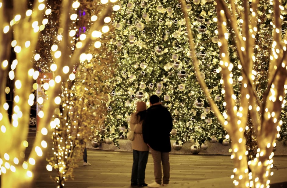 Under the Glow: A Couple Stands Before a Magnificent 75-Foot Christmas Tree