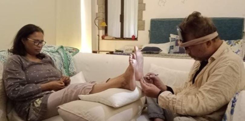 He penned a long note in the caption, as he wrote, “During baba’s most unbearable peak cancer period, mamma used to get corns on her feet, running around and taking care of him. So baba used to tie his phone on his head as a light source and operate on her corns. Both peeling off hardened layers of resistance towards the soft skin of love”.