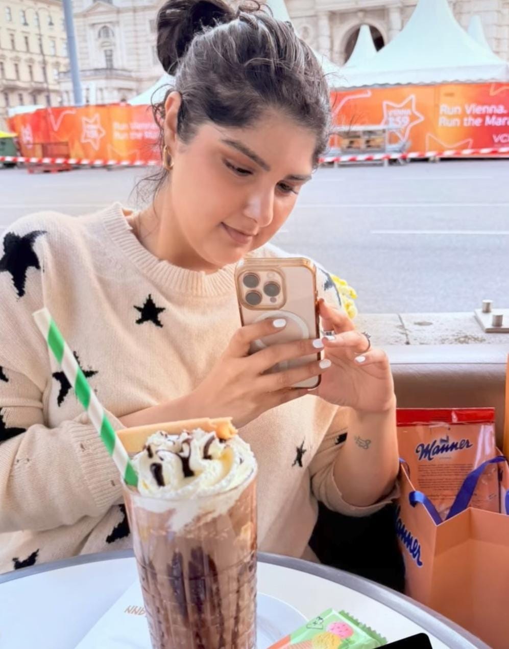 The picture shared by Boney Kapoor on his social media account, shows Anshula seen sitting at a cafe, and clicking a picture of her dessert.