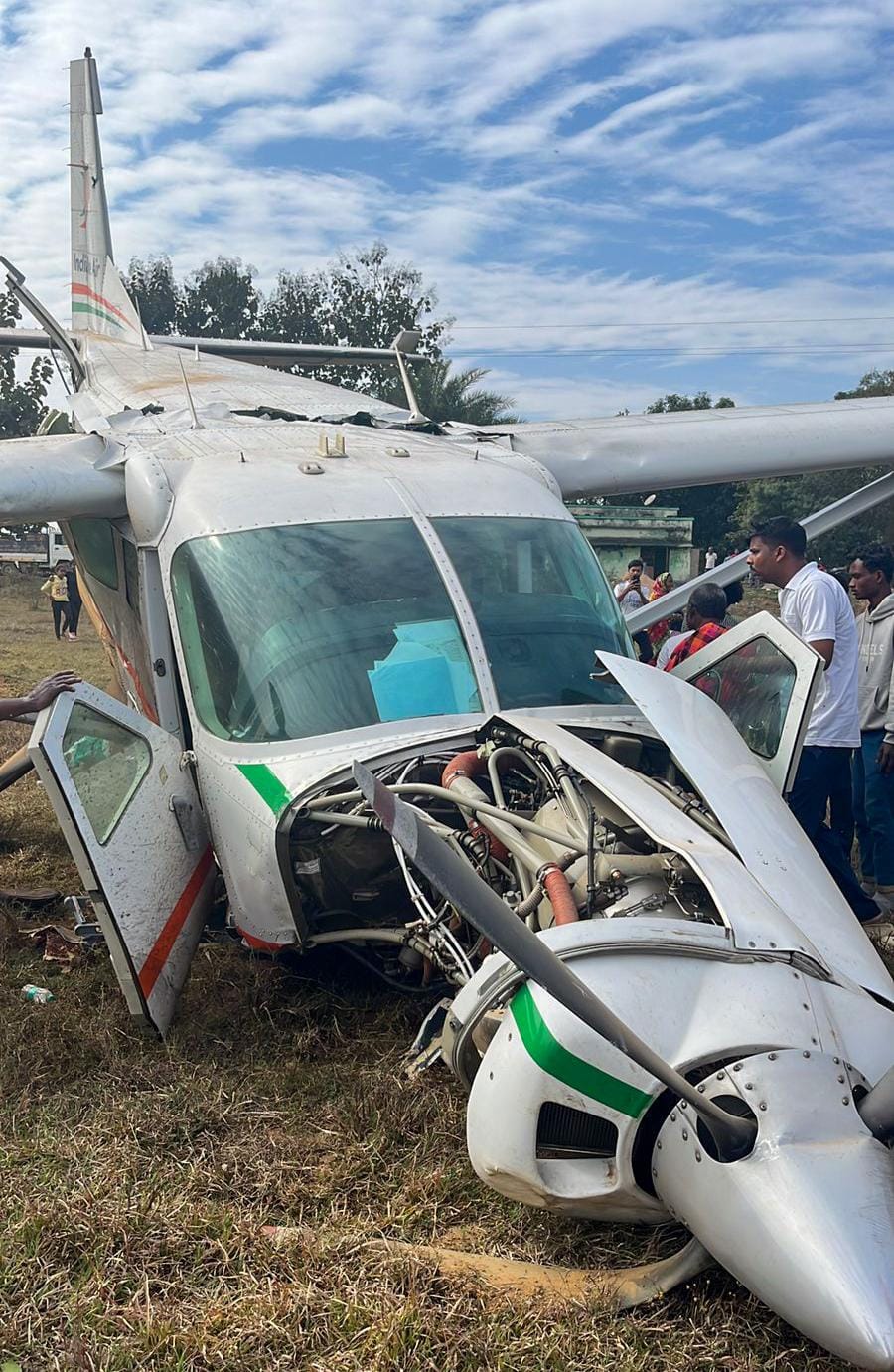 Local people rushed to the spot to carry out rescue operations immediately after the aircraft made a soft landing on a grass surface.
