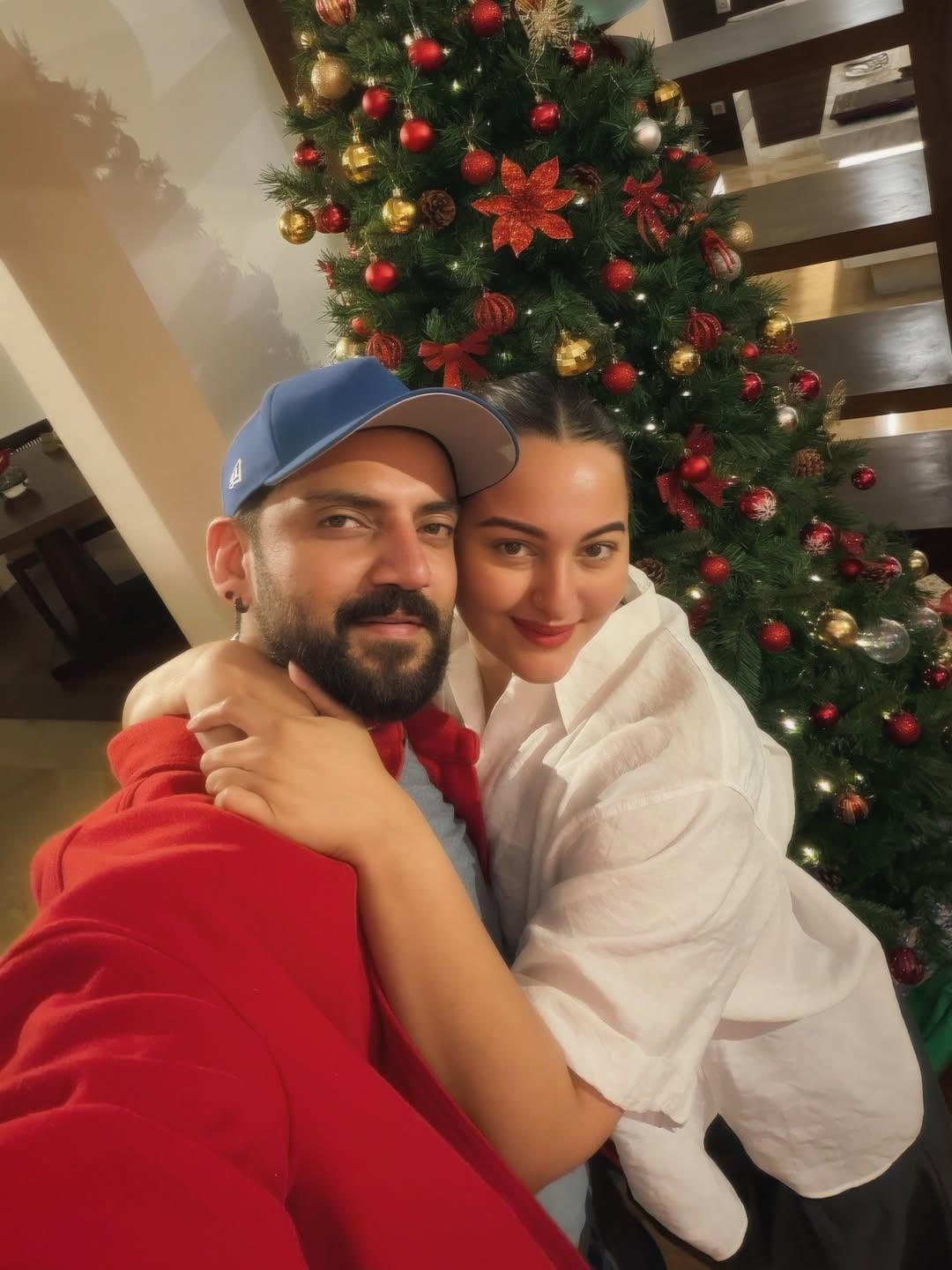 In the images, Sonakshi Sinha and Zaheer Iqbal are seen posing together against a beautifully decorated Christmas tree. The first picture captures Zaheer with his hand gently placed on Sonakshi’s shoulder. The next shows the couple beaming with joy as they pose for the camera.